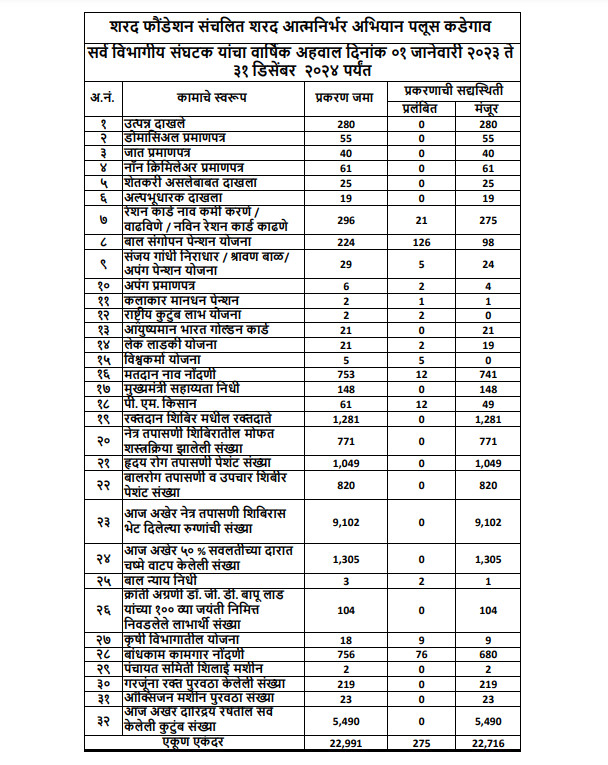 शरद फाउंडेशन कुंडल : दारिद्रय रेषेखालील कुटुंबांचा आर्थिक स्तर उंचावण्यासाठी विशेष मोहिम शरद आत्मनिर्भरमार्फत राबविण्यात येत आहे. या माध्यमातून शासकीय योजनांचा लाभ मिळवून देण्याबरोबर कुटुंबांना स्वयंरोजगारासाठी प्रोत्साहित करणं, संजय गांधी निराधार योजना, श्रावण बाळ योजना या योजनेची अंमलबजावणी सातत्याने मोठ्या प्रमाणात राबविण्यात येते. पलूस व कडेगाव तालुक्यातील अनेक निराधारांना या योजनेचा लाभ मिळवून देण्यात शरद आत्मनिर्भर यशस्वी झाले आहेत आणि लाभार्थी शोध कार्य चालू आहे.